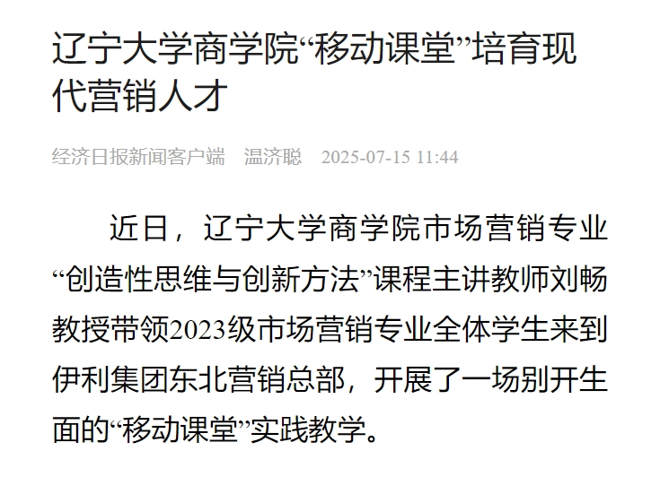 近日,经济日报新闻客户端报道了国产一区二区日本在线刘畅教授带领2023级市场营销专业全体学生来到伊利集团东北营销总部开展实践教学,现将原文转载如下: